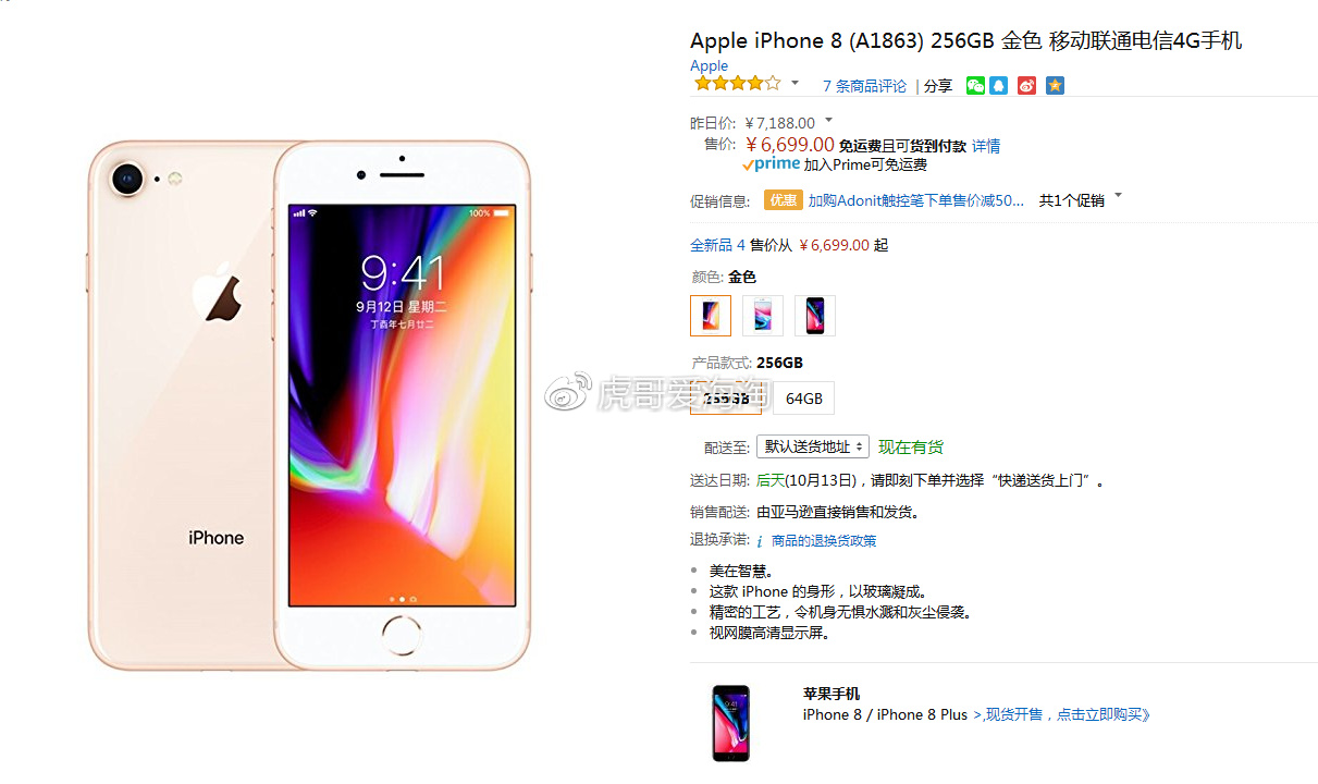 #中亚#Apple 苹果 iPhone 8 智能手机 256GB,现价¥6699(原价¥7188)。主要的升级是SoC(处理器)、摄像头CMOS以及机身材质的改进。采用双面玻璃机身,官方提供了金色、银色以及深空灰配色。其他参数与iPhone 7相比差别不大,保持4.7英寸大小与IP67级别的防尘防水能力,这个尺寸可以轻松放入口袋,在视觉效果与单手持握上达到一个相对的评论,适合喜欢小屏的用户作为主力机使用。点击购买