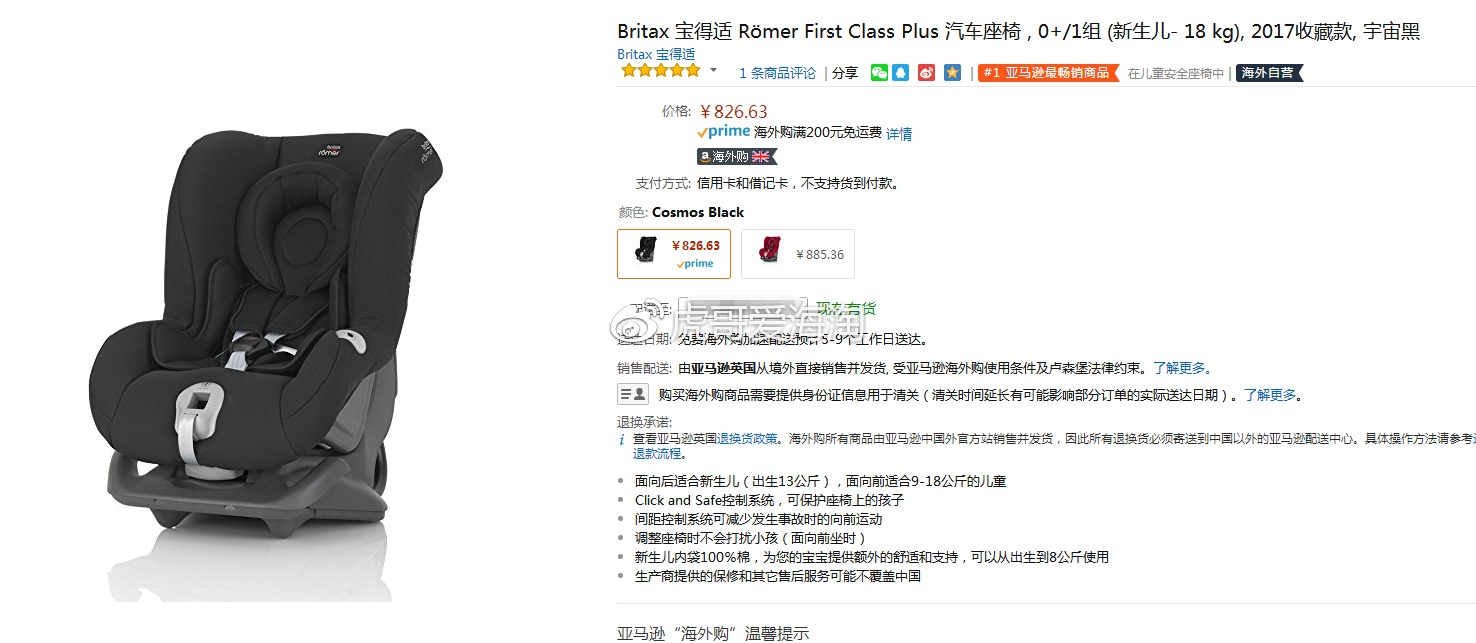 史低价!#亚马逊海外购#英亚直邮:Britax百代适 First Class Plus 头等舱白金版儿童安全座椅 ¥826.63会员免费直邮含税新低¥925,宝宝0-13公斤时,安全座椅适宜反向安装,9-18公斤适宜前向安装。安装接口为车载三点式安全带。点击购买