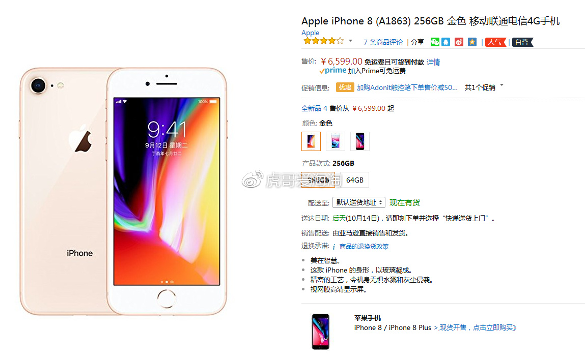 #中亚#Apple 苹果 iPhone 8 智能手机 256GB,现价¥6599(原价¥7188)。主要的升级是SoC(处理器)、摄像头CMOS以及机身材质的改进。采用双面玻璃机身,官方提供了金色、银色以及深空灰配色。其他参数与iPhone 7相比差别不大,保持4.7英寸大小与IP67级别的防尘防水能力,这个尺寸可以轻松放入口袋,在视觉效果与单手持握上达到一个相对的评论,适合喜欢小屏的用户作为主力机使用。点击购买