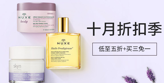 【法国天然护肤品牌Nuxe欧树】买三免一!崇尚自然的欧树将现代科技与植物芳香疗法融合,温和低刺激,适合各类肌肤。鲜奶霜、玫瑰花水、蜂胶洁面等都是明星产品。