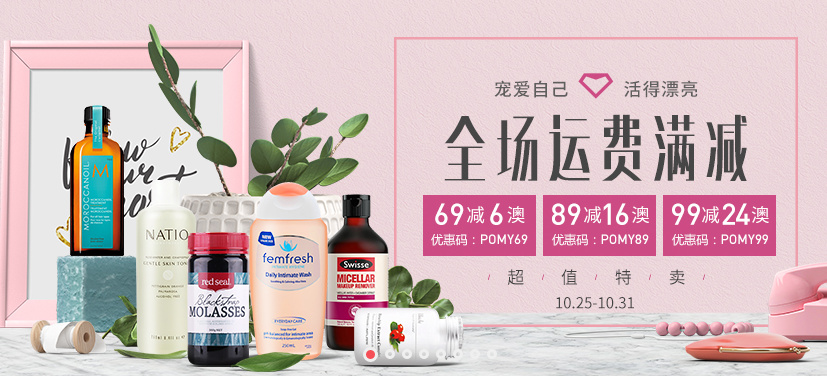 全场运费满减,满69澳减6澳,优惠码:POMY69;满89澳减16澳, 优惠码:POMY89; 满99澳减24澳, 优惠码:POMY99;