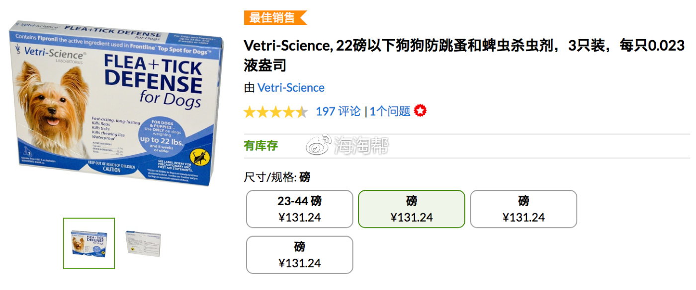 22磅以下狗狗防跳蚤和蜱虫杀虫剂,3只装,每只0.023液盎司,参考价格:131.24
