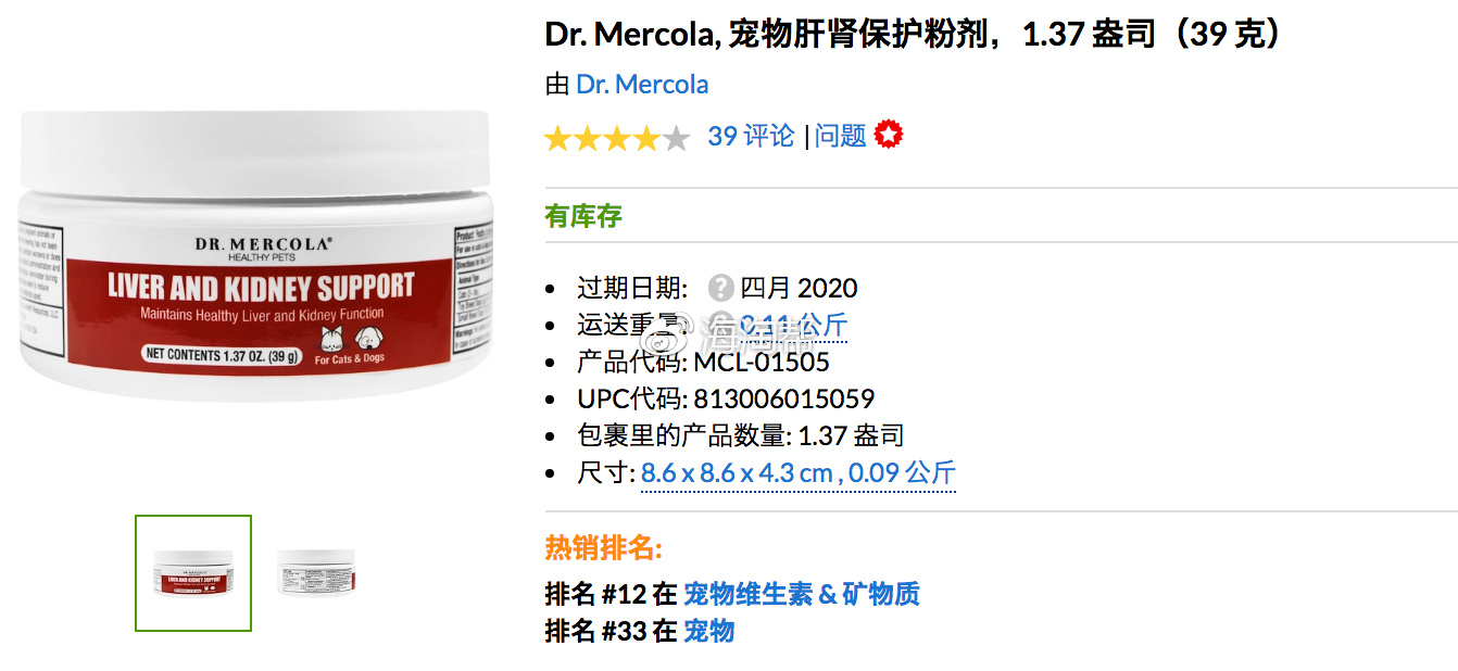 7.Dr. Mercola, 宠物肝肾保护粉剂,1.37 盎司(39 克),参考价格:90.95