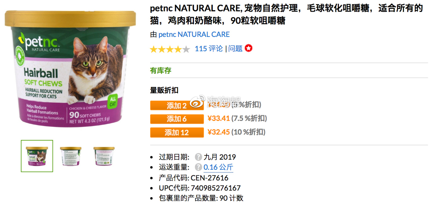 宠物自然护理,毛球软化咀嚼糖,适合所有的猫,鸡肉和奶酪味,90粒软咀嚼糖,参考价格:36.09