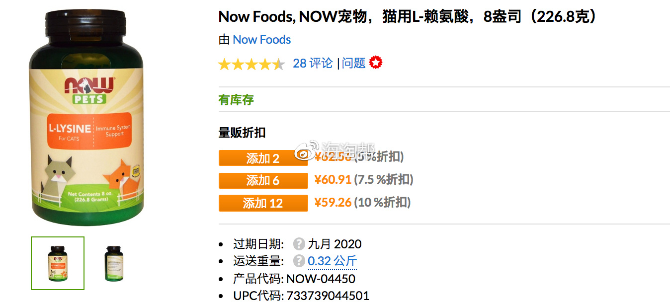 NOW宠物L-赖氨酸粉有助于支持健康的抵抗系统、正常的呼吸健康、还有助于保持眼部健康。体弱多病或者品种猫必备,每天150mg