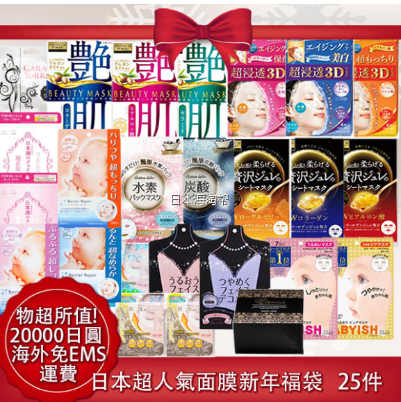 包邮福袋【日本超人气豪华面膜福袋 25款 共计178片】包括肌美精、曼丹、佑天兰、KOSE品牌等热销面膜及眼膜!20000日元。http://t.cn/RJ2t4og