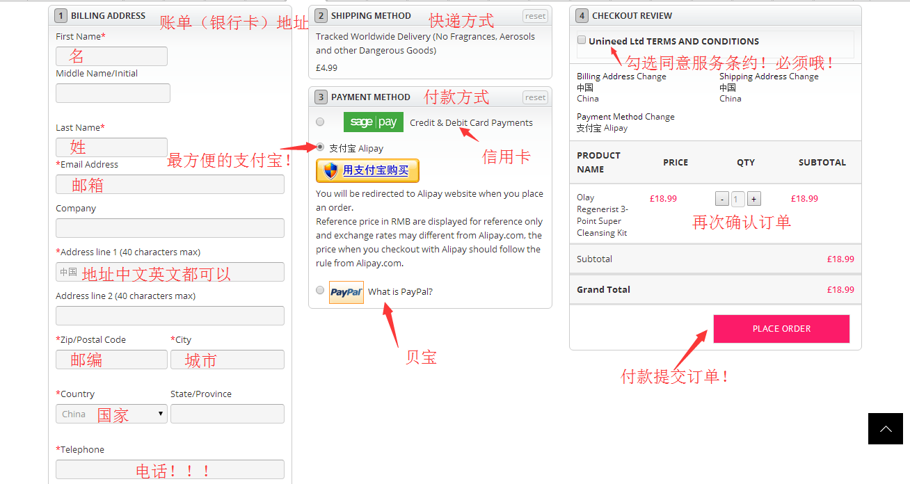 Unineed网站满40英镑全球包邮,被税几率比较小,地址可以用中文填写,可用信用卡和支付宝付款(国家选“china“后,就会出现支付宝付款选项)。