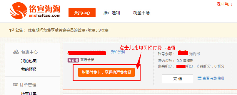 您只需要登录系统,可以看到会员名下面有一个【购预付费卡,享超值运费套餐】的按钮,点击购买即可享受相应等级的运费套餐。