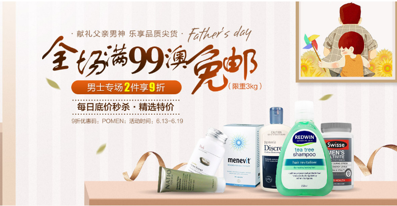 父亲节特惠:全场满109澳减15澳,优惠码:P15;满89澳减9澳,优惠码:P9。活动截止到6月18日。专区戳:http://t.cn/R6mOIew