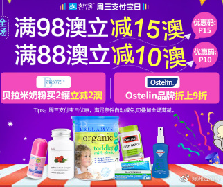 #澳洲海淘#包税直邮【澳洲P4L】月末回馈!全场阶梯式满减,满98澳立减15澳,优惠码:P15,满88澳立减10澳,优惠码:P10,支付宝日贝拉米奶粉买两罐立减2澳,Ostelin折上9折,生物岛全线7折起,澳洲驱蚊冠军依旧好价,澳佳宝低至4折!还有超多优惠好物等你带走~ 戳这里购买~