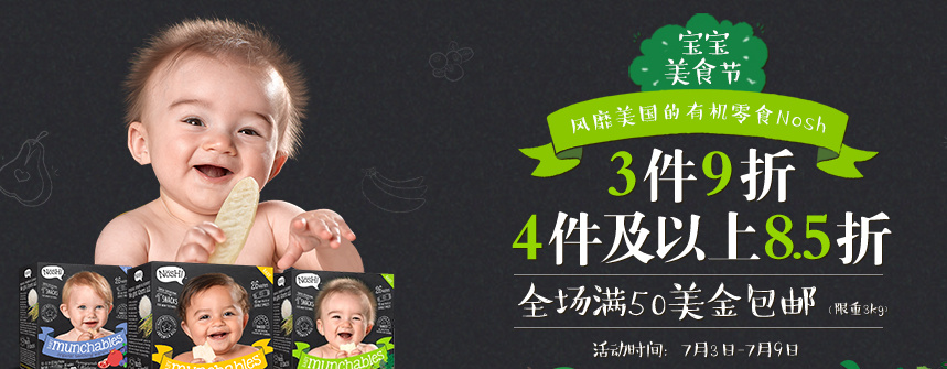 宝宝美食节:现有风靡美国的有机零食专场三件9折、4件及以上85折!全场满$50包邮(限重3KG)。嘉宝、禧贝、地球最好等品牌的果泥、米粉、饼干等可以给宝宝们收啦~
