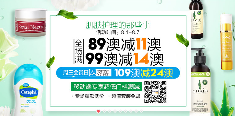 全场满89澳减11澳,满99澳减14澳,支付宝日满109澳立减24澳!移动端专享超低门槛满减,另有专场爆款超低价及超值套装免邮!