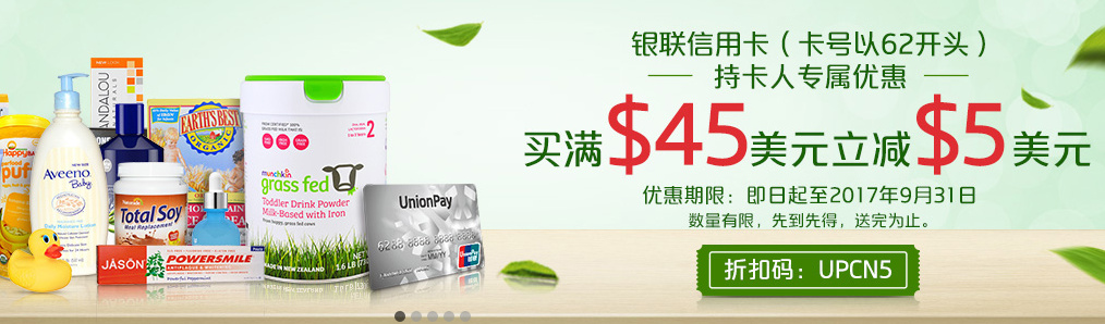 中国大陆地区,使用62开头银联单币信用卡结账,满45美金立减5美金!折扣码:UPCN5。数量有限,先到先得!