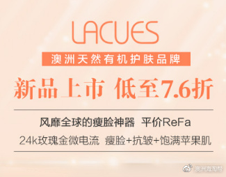 6. 心心念念的澳洲Lacues瘦脸仪终于上线!!风靡全球的瘦脸神器,平价ReFa!24K玫瑰金微电流,瘦脸+抗皱+饱满苹果肌!促进毛细血管血液循环,提高新陈代谢使肌肤焕彩~还有新品牛油果CC霜和变色口红满足你爱美的心~戳这里购买~