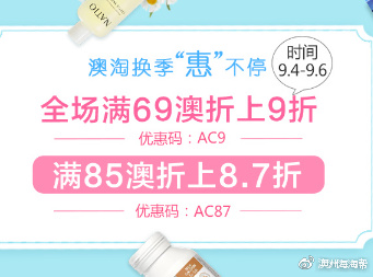 #澳洲海淘#包税直邮【澳洲CD】全场无门槛85折!还有超值免邮3重券~最高可省24澳 ,活动时间:9.1-9.6 苏芊纯天然护肤全场低至6折!DJ&A零食任选3件折上9折!healthycare全场好价!戳这里购买~