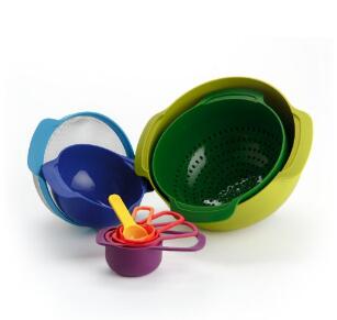 Joseph Joseph 9 Piece Compact Mixing Bowl, Food Prep and Measuring Set, Nest 9,今天这款Joseph Joseph彩虹厨具九件套,设计新颖独特,包括不同大小的搅拌碗、沥水碗、不锈钢滤网、量杯、小勺,从大到小能很好的堆叠在一起,能够最大限度节省空间。
