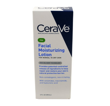 这款CeraVe Moisturizing Facial Lotion PM 夜间美白保湿修复乳液,主打修复,富含细胞沟通因子,添加了VB3,耐受的童鞋可以用来晚间修复。产品内添加了神经酰胺、烟酰胺、及透明酸质等成分都是不错的促进肌肤保湿水润的元素,适合干性肌肤及中性肌肤使用,不适合痘痘肌。规格89ml。