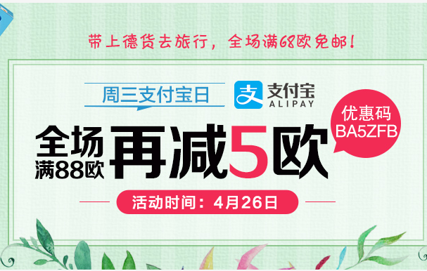 全场除奶粉外购物满68欧免费直邮到中国,不限重,有效期至北京时间 2017年04月26日23点59分。