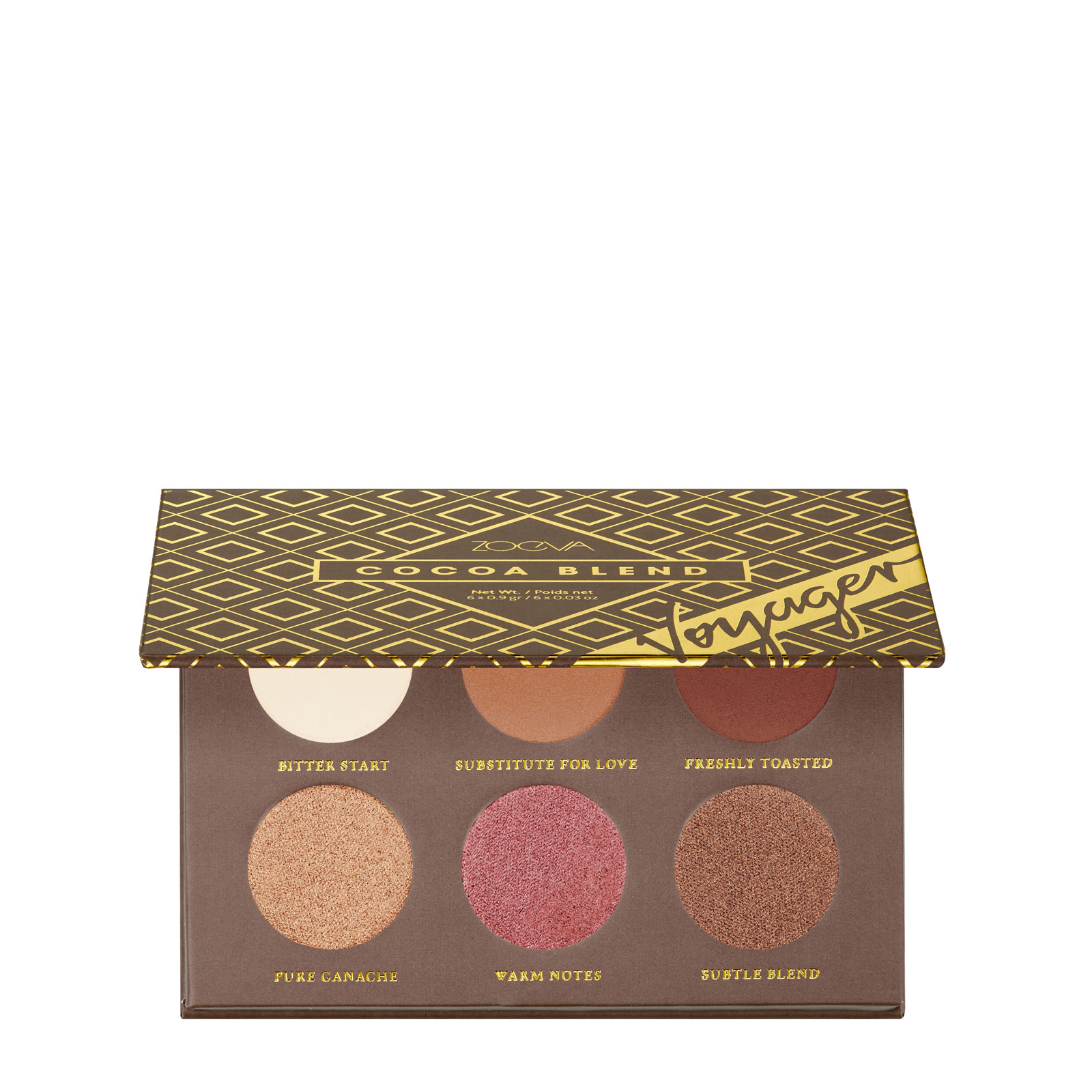 ZOEVA 的眼影盘中可可盘是非常经典的一个眼影盘,新出的迷你尺寸的眼影盘,颜色精简到6个颜色,三个哑光色加上三个珠光色,红棕,金棕色的金属色,加上哑光白色和驼色的结合,实用性超级棒,小巧好携带。金属色质感非常优秀,很好晕染,眼妆的可变性也非常强。