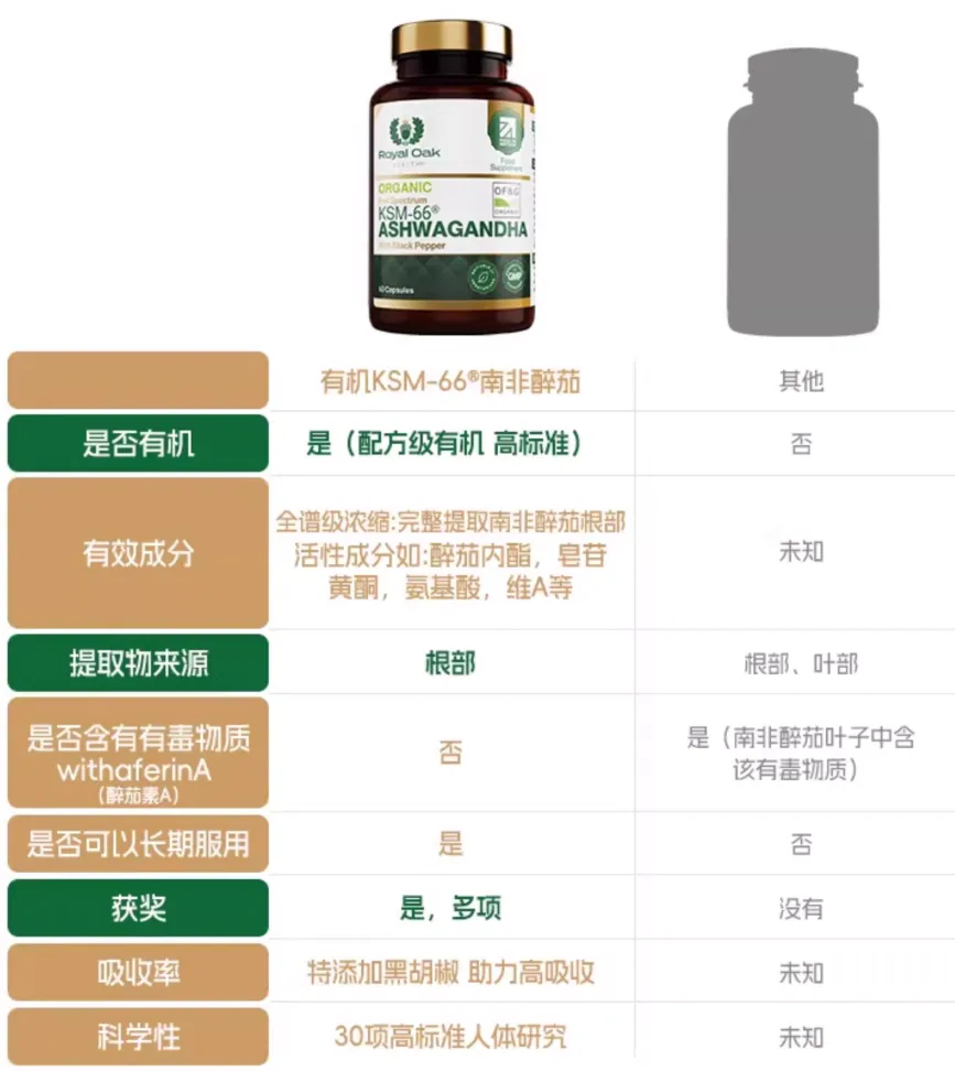 买南非醉茄,要看有没有认证和醉茄内酯的含量,这瓶采用的是全球研究足够充分的KSM-66专研南非醉茄提取物,有欧盟等三重有机认证,醉茄内酯含量>5%,添加了黑胡椒提取物帮助吸收,吸收率max,比普通的更有效。