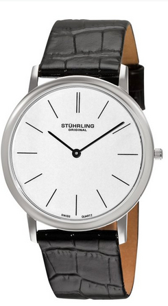 特价!【Stuhrling 601.33152斯图灵男士经典超薄手表】 原价$245,现价$78.97!此款斯图灵男士经典手表外观非常的优雅,采用黑色鳄鱼皮纹表带搭配银色抛光圆形表壳,内置优质的瑞士石英机芯,保证时间精确,耐划痕的Krysterna表镜下为白色表盘,表盘上镶有黑色条形全时刻度